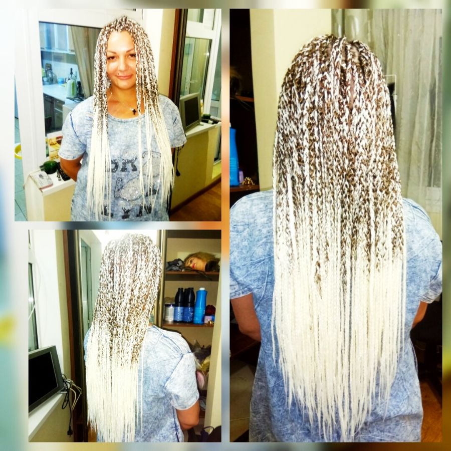 Плетение Афрокосы Классика в тёмно-русые волосы Клиентки длиной по лопатки вплели белый канекалон! Получился эффект омбре, чего и хотела Клиентка! Свободный кончик Афро, вышло 140 косичек!