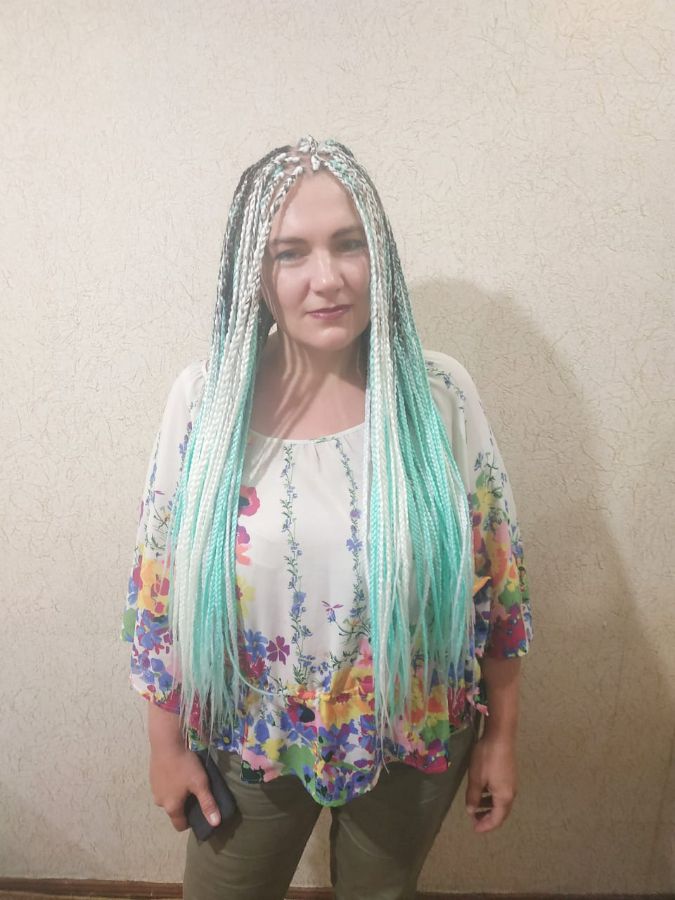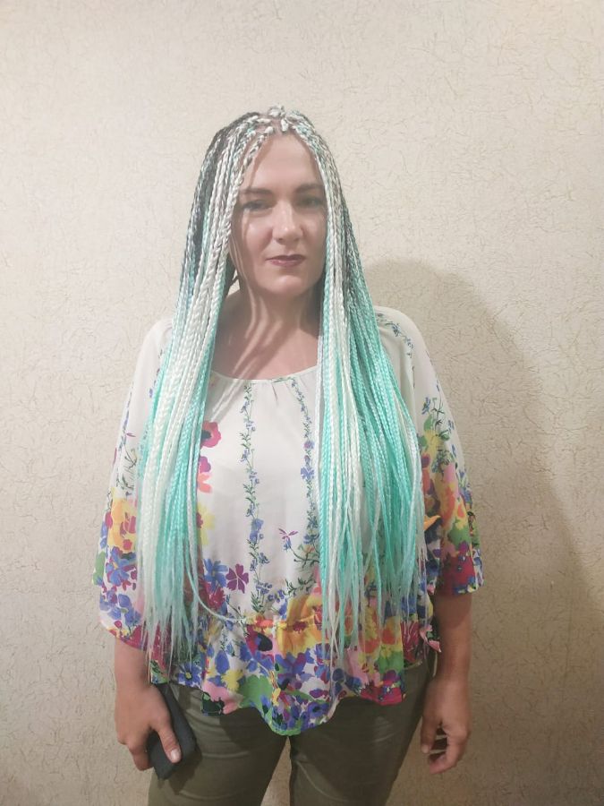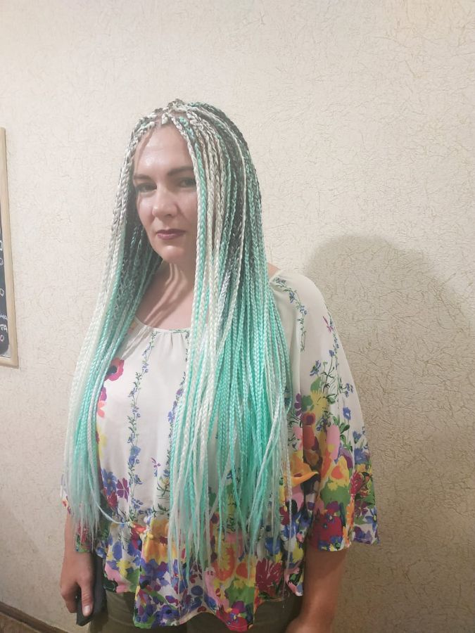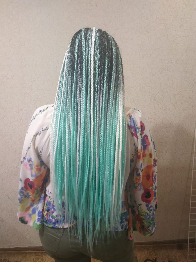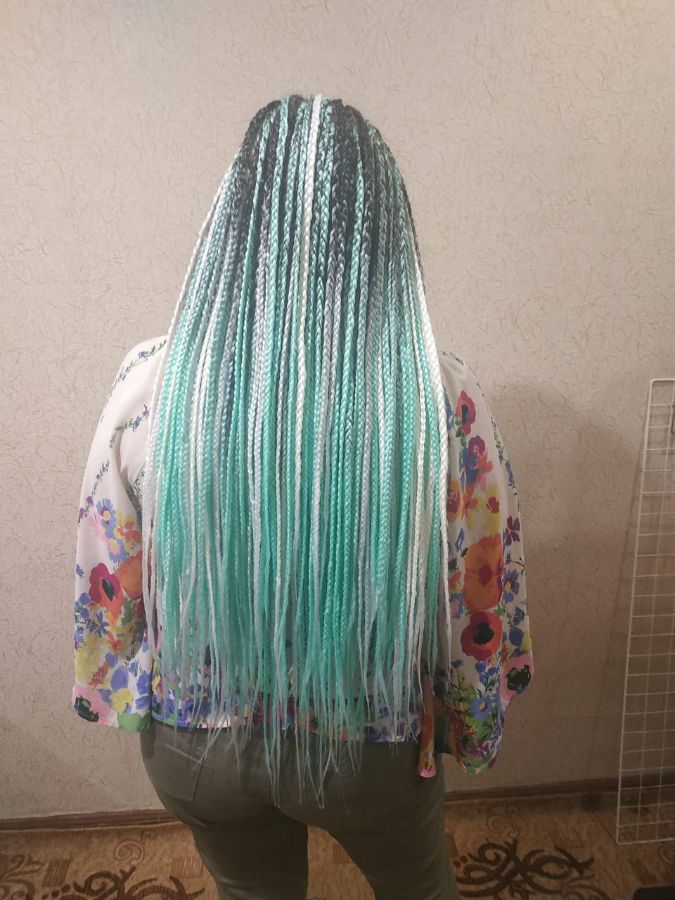 Заплели афрокосички классика, два цвета, мятный и белый, свободный кончик, время ношения таких косичек от 1 до 3 месяцев!